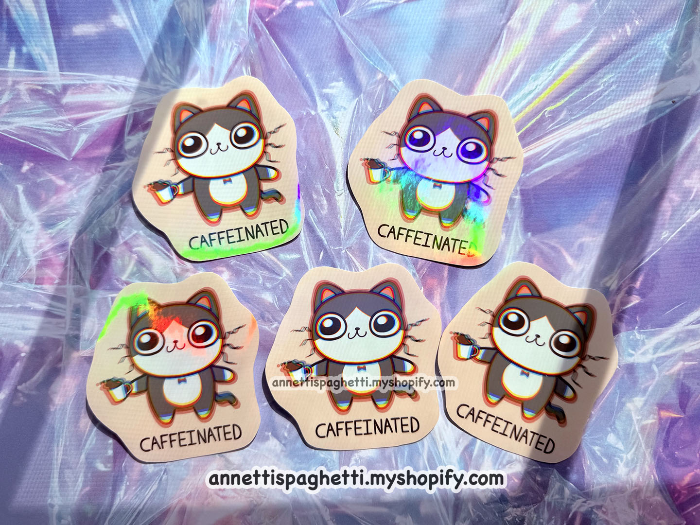 🌸 Holographic sticker of a very awake cat zooted on caffeine. Super fun!