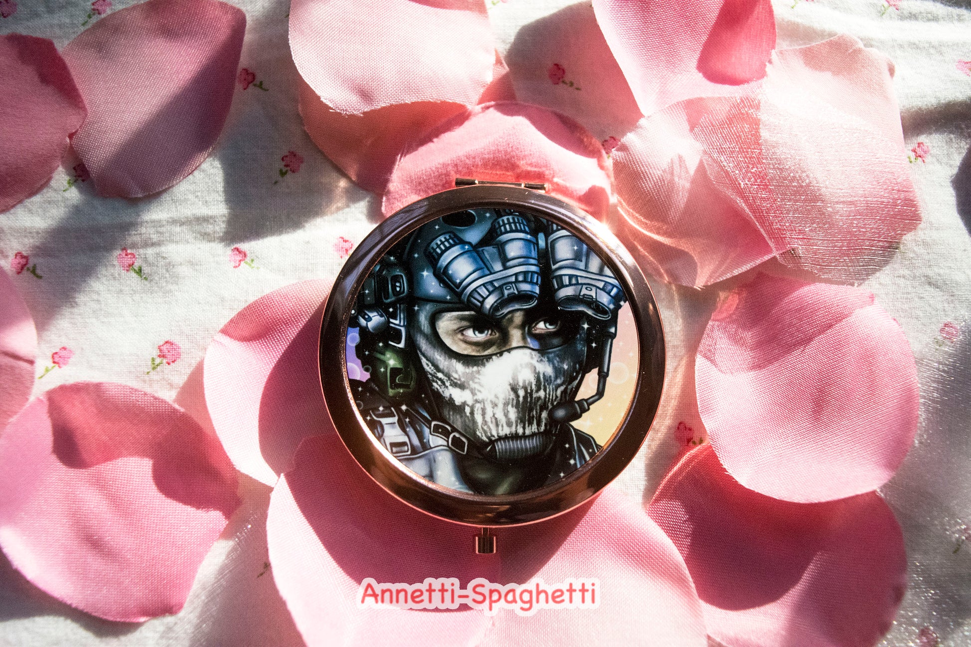 💖 Vibrant rose gold compact mirror featuring Ghost, König, and Keegan. Ain't they dreamy? A practical, artsy addition to your everyday arsenal. The compact has mirrors on both sides when open.